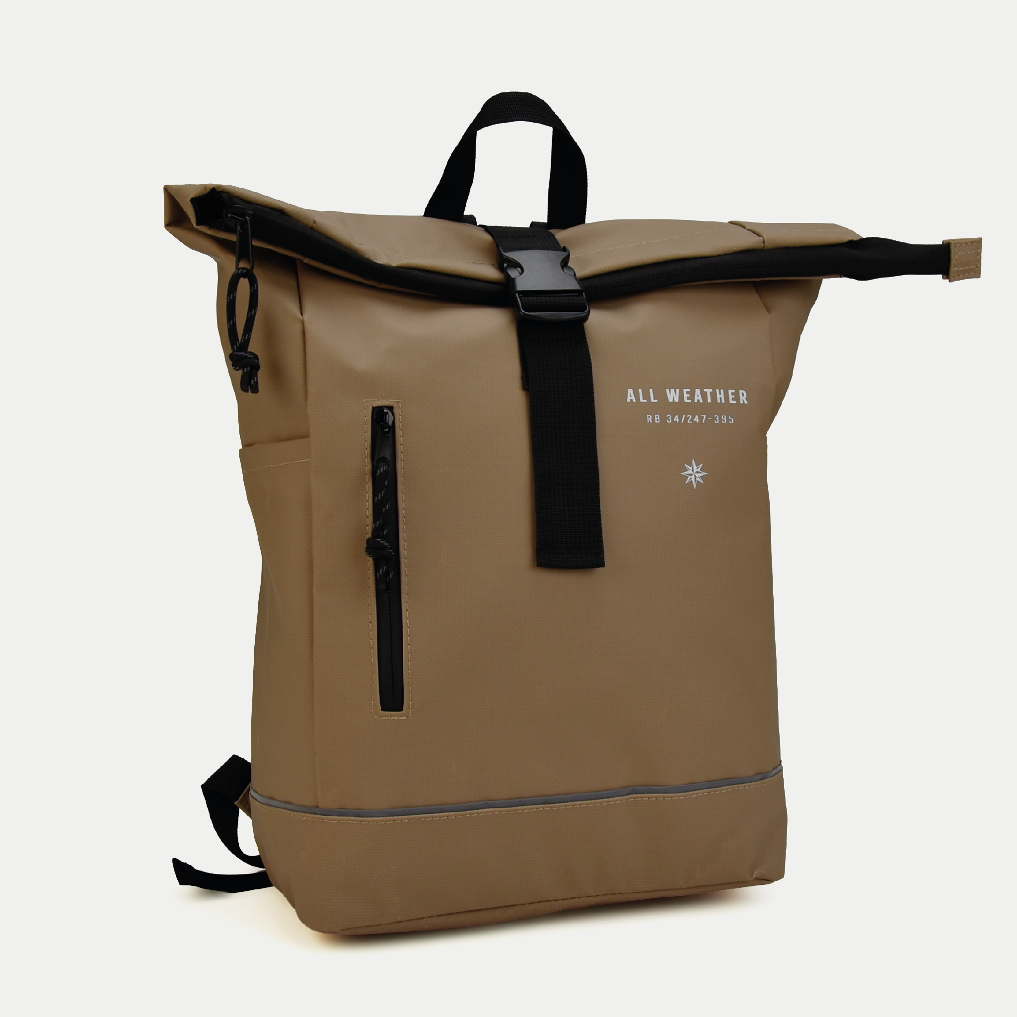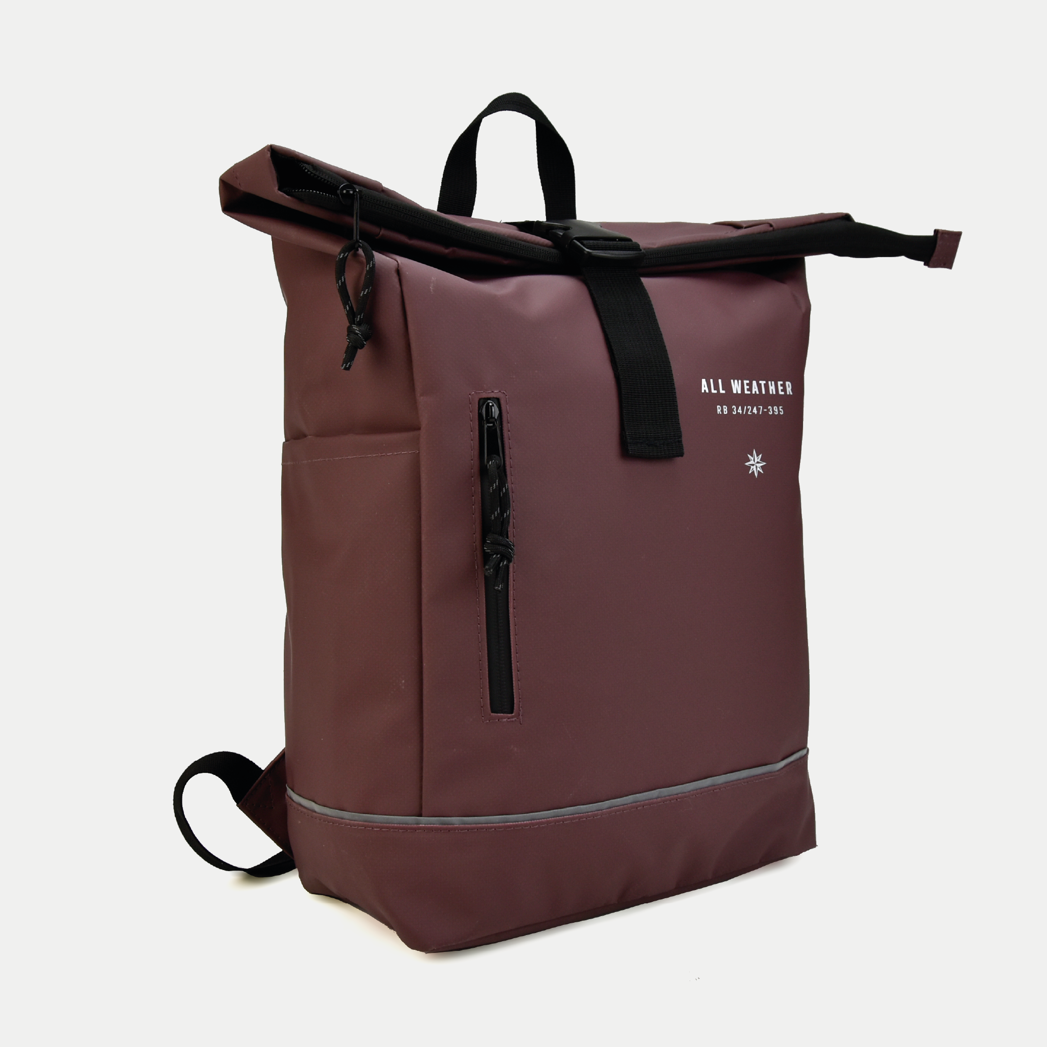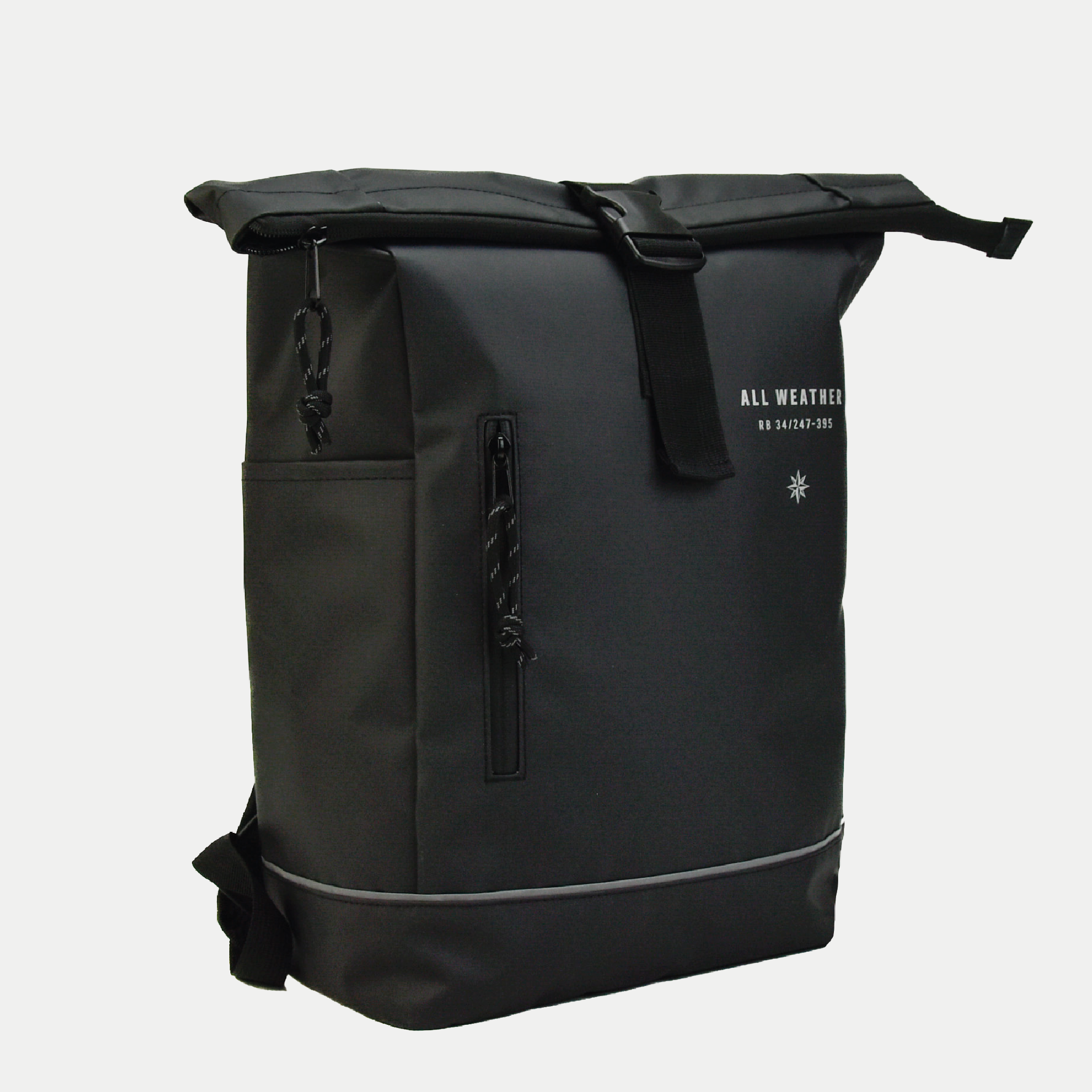All-weather bicycle/backpack with laptop compartment and side pocket.